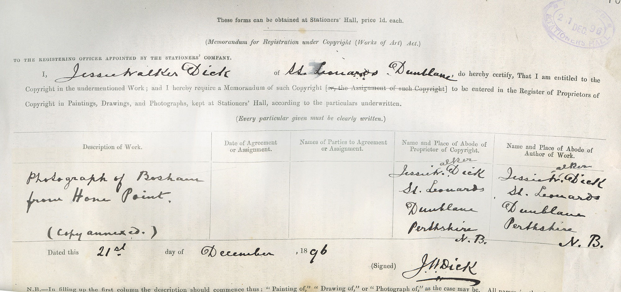 As you can see in the entry below, this print was deposited on the 21st December 1896 by Jessie W Dick of St. Leonards, Dunblane, Perthshire and is titled 'Photograph of view at Bosham, church in background, water in foreground'. It's perhaps the most interesting view of Bosham's old mill pond I have seen to date, showing the open field to the right that is now used as a dinghy park by Bosham Sailing Club, beyond in the distance the end of a ship can be seen on the stocks, behind the houses. Is the lady on the right in front of the haystack picking blackberries? It does give a sense of just how big Bosham's millpond actually was when the watermill was in operation on Bosham Quay. To read more about Bosham's old watermill and millpond please click here.
