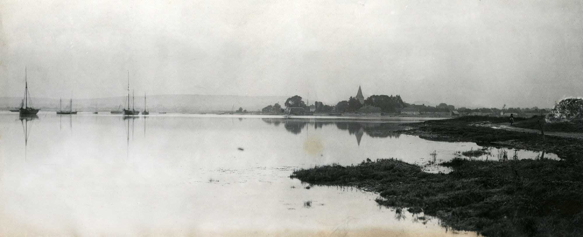 This second print was also deposited by Jessie Walker Dick on the same date and is titled 'Photograph of Bosham from Hone Point'. The photographer has captured the scene at a lovely state of the tide with the seagrass and curve of the road providing interest in the foreground, in the background we see the classic view of Bosham reflected beautifully in the sea. On the left we see fishing boats moored off the Quay. Notice the quite subdued tones of the print (sky and sea) typical of 19th century prints compared to today's much brighter prints our eyes are used to seeing, which along with the gentle neap tide create a wonderful sense of tranquillity. To read more about Bosham's fishing fleet in the 19th century please click here.