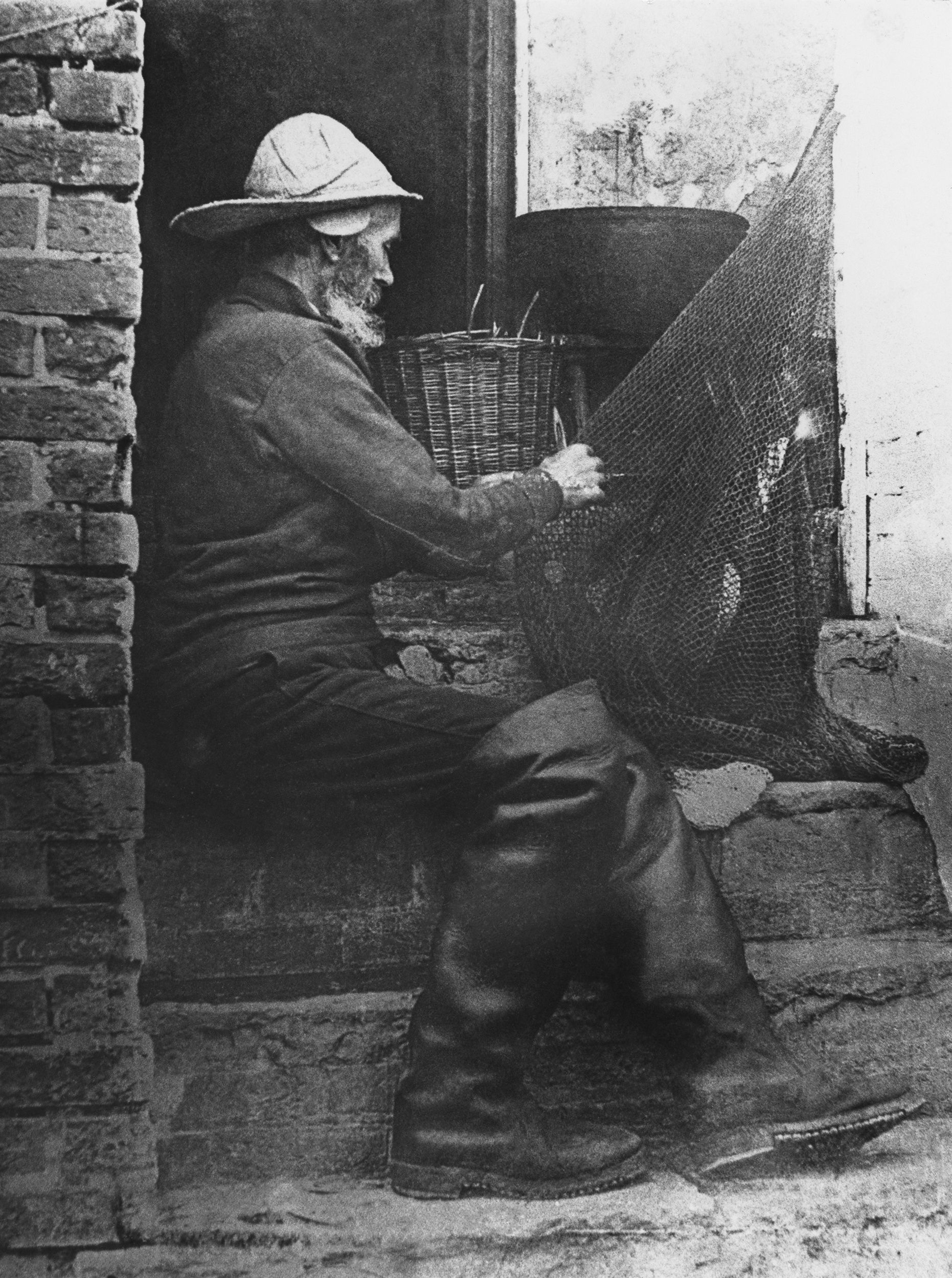 Gregory Major in his sou'wester, mends his nets on the steps of his home on Shore Road, Bosham. Sou'westers are traditional collapsible oilskin rain hats worn by offshore fishermen, featuring longer backs to protect the neck from rain.