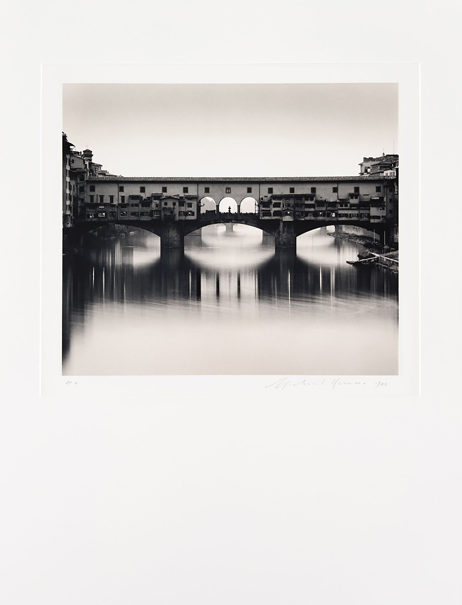 “There can be doubt that Florence is one of the most beautiful and romantic cities on the face of the earth. I have had the good fortune to have made sporadic visits there since the seventies. On arrival in the 'cradle of the Renaissance' I find that it is first necessary to revisit familiar old friends such as the Duomo, Uffizi, Piazza della Signoria, Pitti Palace, etc. A long walk (or run) along the Arno is also de rigueur. Bridges have long fascinated me, and I photograph them whenever I can. Some of my favourites include the Charles Bridge in Prague, Brooklyn Bridge in New York, Pont des Arts in Paris and Golden Gate Bridge in San Francisco. There are many more, of course, and the Ponte Vecchio in Florence is very high in my estimation. I have photographed it several times, for the most part unsuccessfully. Many average pictures of this exquisite bridge lie dormant in my negative archives. However, I believe that this study of Ponte Vecchio from 1988 is an exception and rises high above my other attempts. The photograph was made on a late Winter afternoon. I had been out of Florence that day exploring the countryside, but there was something about the light that drew me back to the centre of the city. A light mist was in the air, and it was chilly. I knew the location on the Ponte Santa Trinita from where I would photograph. I had reconnoitred it on walks, and as we all know, fortune favours the prepared. I arrived just when the daylight was beginning to fade, and streetlights were coming on. I placed my camera on a tripod, composed the image and began to make pictures. My exposures must have been in the range of one to ten minutes in order to capture movement in the water. In the print, I can see figures on the bridge, so the exposure for this negative would have been on the shorter side. The balance of light and darkness works perfectly for me. Any lighter and there would too many details, any darker and the lights would become too bright and prominent. I think that suggestion is often more important than description. Too much information can sometimes be redundant if we are already familiar with subject matter. Whereas more sparse elements in an image can act as catalysts to conjure up our own experiences and memories. Such is the case for me with this print of Ponte Vecchio. Every time I view this print, I am immediately transported back to Florence and in my imagination, I can once again wander around and experience this Italian jewel. Negroni anybody?