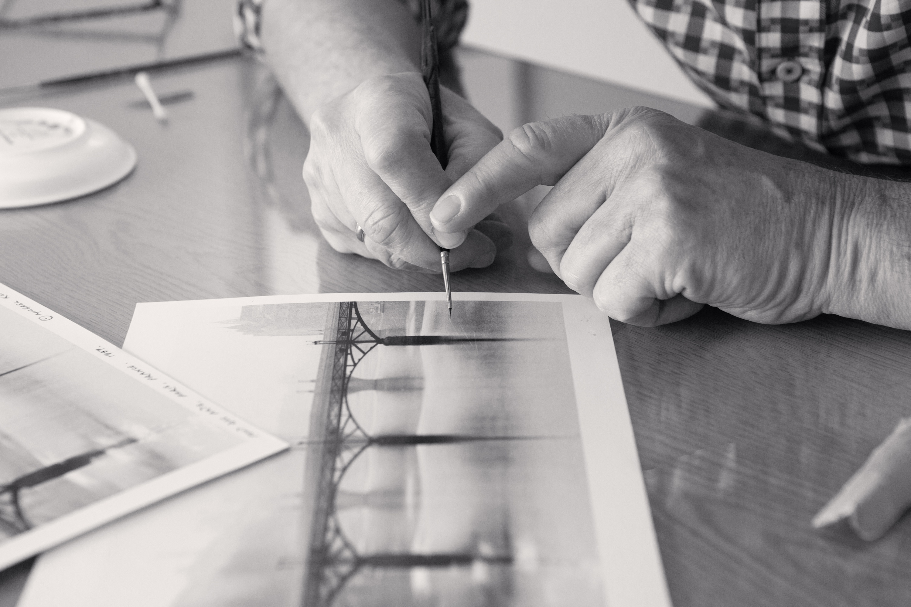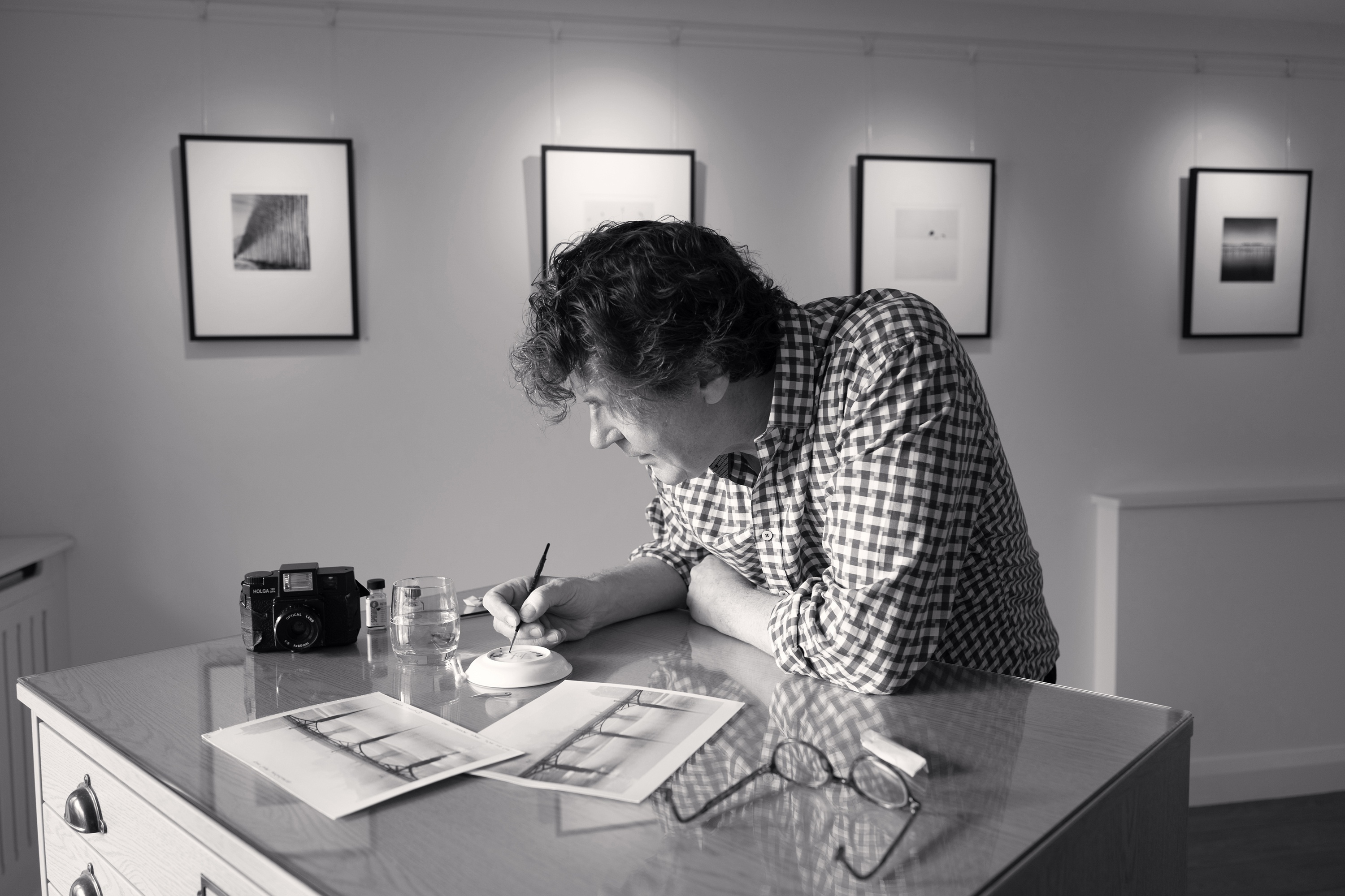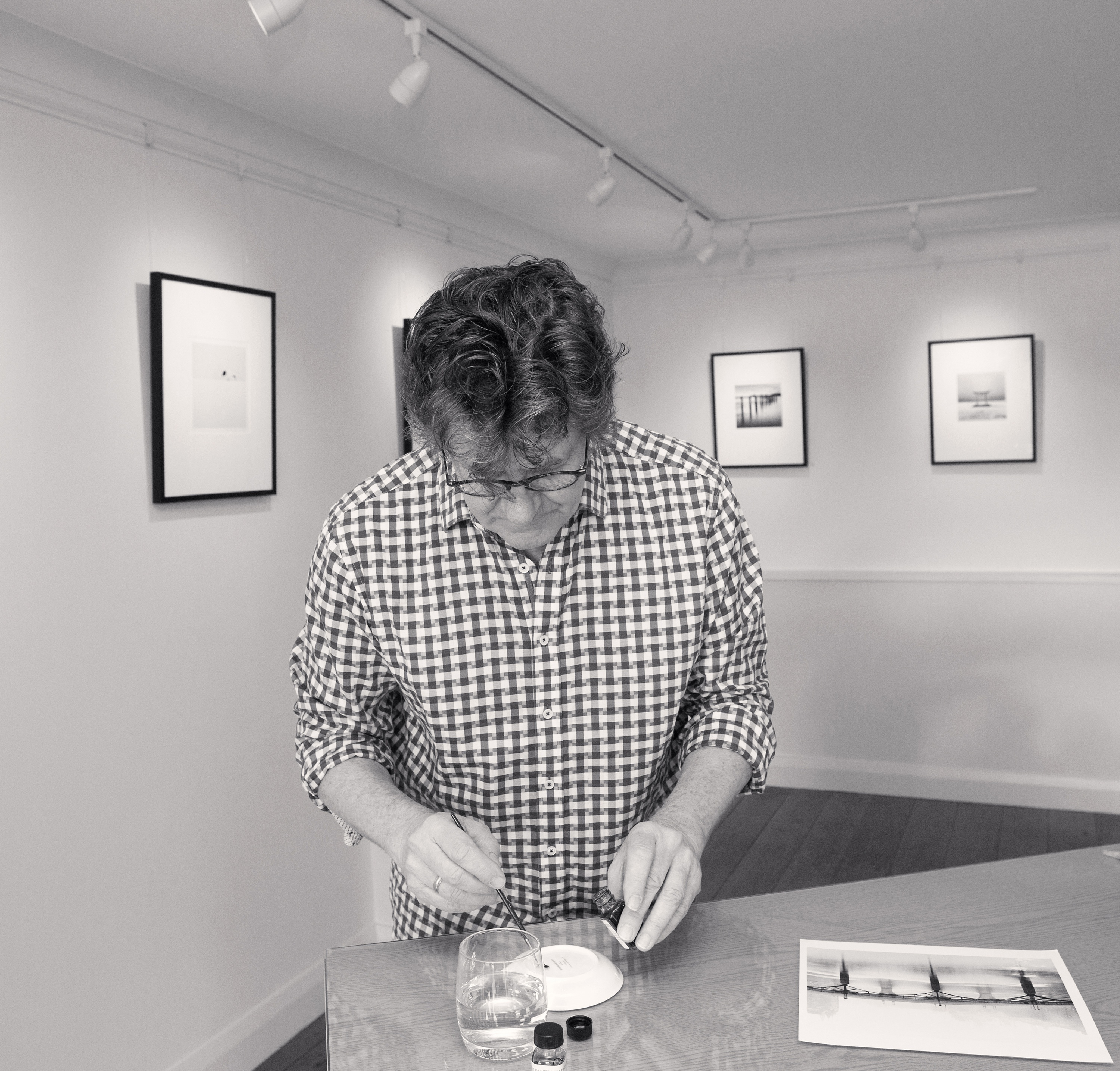 “I watched Michael Kenna retouch a print by hand in my gallery in Bosham in 2019 during an exhibition of his New & Rare Works, and it was like seeing magic! The retouching process was so extraordinary that I joked with Michael that he had turned the gallery into a scene from Hogwarts. At any moment I expected Dumbledore to walk in! Unless one experiences retouching in person, I don’t think it is possible to appreciate the skill and patience to make adjustments to the surface of a silver print with fine paint brushes and retouching dyes. The print in question was Pont Des Arts, Study 1, Paris, France, 1987 and a small speck on the surface of the silver gelatin print needed to be retouched. It was caused by a tiny scratch to the negative. Before I share an extract from Michael Kenna’s print diaries, along with photographs of Michael retouching the print, it is important to explain the nature of retouching prints as part of the overall process of making wet chemistry silver gelatin prints. As Michael points out, it is almost impossible to make silver prints from negatives without there being some small white dust spots on the prints or the occasional black specks caused by scratches on the negatives. These have to be carefully retouched by hand with coloured dyes and fine retouching brushes. If a silver print is examined closely in the right lighting, it is possible to see how the image is embedded in the silver gelatin, rather than sitting on the surface of the paper as per a modern pigment print.